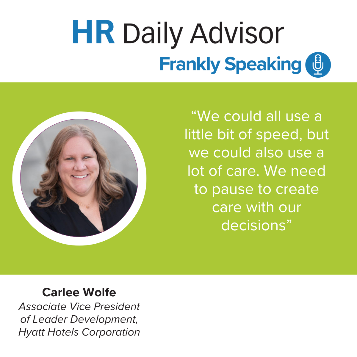 During an interview with Carlee Wolfe, Associate Vice President of Leader Development and Organizational Effectiveness at Hyatt Hotels Corporation, she told HR Daily Advisor that the core of Hyatt Hotel’s development is to never move so fast you forget to make decisions with empathy.